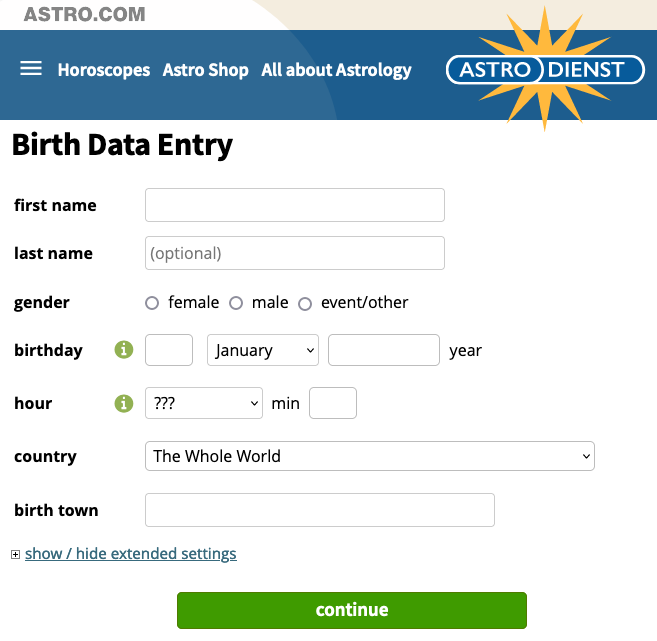 In order to generate your birth chart, you need to know your basic birth info, which consists of birth date, location and exact (!) birth time. Knowing your exact birth time is crucial for getting an accurate birth chart, so make sure you check your birth certificate or ask someone who was present at your birth.